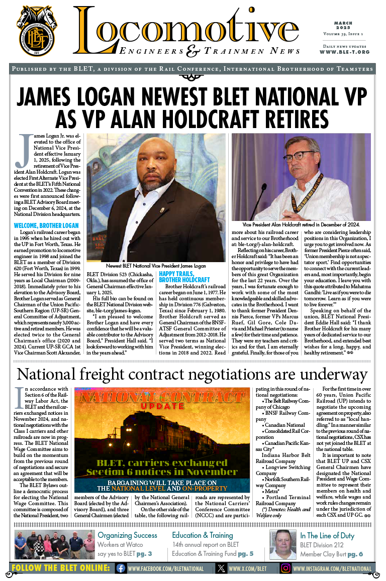 BLET Newsletters View and download current and previous BLET Newsletters below. October 2025 March 2025 October 2024 March 2024 November 2023 January-March 2023 2022 Newsletters August / September 2022 April – July 2022 January-March 2022 2021 Newsletters August / September 2021 June / July 2021 March-May 2021 January / February 2021 2020 Newsletters October-December 2020 September 2020 July / August 2020 May / June 2020 April 2020 February / March 2020 January 2020 2019 Newsletters November 2019 August-October 2019 July 2019 June 2019 April / May 2019 February / March 2019 January 2019 2018 Newsletters November 2018 October 2018 August / September 2018 July 2018 June 2018 May 2018 April 2018 March 2018 February 2018 January 2018 2017 Newsletters November / December 2017 September / October 2017 August 2017 July 2017 June 2017 May 2017 April 2017 March 2017 February 2017 January 2017 2016 Newsletters November 2016 October 2016 September 2016 August 2016 July 2016 June 2016 May 2016 April 2016 March 2016 February 2016 January 2016 2015 Newsletters December 2015 October / November 2015 September 2015 July / August 2015 May / June 2015 March / April 2015 January / February 2015 2014 Newsletters December 2014 November 2014 October 2014 August / September 2014 July 2014 June 2014 April / May 2014 February / March 2014 January 2014 2013 Newsletters November / December 2013 October 2013 August / September 2013 July 2013 June 2013 April / May 2013 February / March 2013 January 2013 2012 Newsletters November / December 2012 October 2012 September 2012 August 2012 July 2012 June 2012 April / May 2012 March 2012 February 2012 January 2012 2011 Newsletters December 2011 October / November 2011 September 2011 August 2011 June / July 2011 May 2011 April 2011 March 2011 January / February 2011 2010 Newsletters December 2010 October / November 2010 September 2010 August 2010 July 2010 June 2010 April / May 2010 March 2010 January / February 2010 2009 Newsletters December 2009 November 2009 October 2009 September 2009 August 2009 July 2009 June 2009 May 2009 April 2009 March 2009 February 2009 January 2009 2008 Newsletters December 2008 November 2008 September / October 2008 August 2008 July 2008 May / June 2008 April 2008 March 2008 February 2008 January 2008 2007 Newsletters December 2007 November 2007 October 2007 September 2007 August 2007 June / July 2007 May 2007 April 2007 March 2007 February 2007 January 2007 2006 Newsletters December 2006 November 2006 October 2006 September 2006 August 2006 July 2006 June 2006 May 2006 April 2006 March 2006 February 2006 January 2006 2005 Newsletters December 2005 November 2005 October 2005 September 2005 August 2005 July 2005 June 2005 May 2005 April 2005 March 2005 February 2005 January 2005 2004 Newsletters December 2004 November 2004 October 2004 September 2004 August 2004 July 2004 June 2004 May 2004 April 2004 March 2004 2003 Newsletters December 2003 November 2003 October 2003 September 2003 August 2003 July 2003 June 2003 May 2003 April 2003 March 2003 February 2003 January 2003 2002 Newsletters December 2002 November 2002 October 2002 September 2002 August 2002 July 2002 June 2002 May 2002 April 2002 March 2002 February 2002 January 2002 2001 Newsletters December 2001 November 2001 October 2001 September 2001 August 2001 July 2001 June 2001 May 2001 April 2001 March 2001 February 2001 January 2001 2000 Newsletters December 2000 November 2000 October 2000 September 2000 August 2000 July 2000 June 2000 May 2000 April 2000 March 2000 February 2000 January 2000 1999 Newsletters December 1999