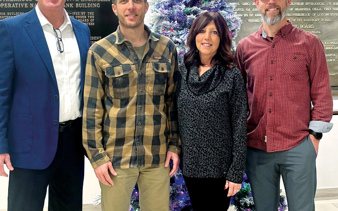 From left: Tom Grdina with family at his December 30 retirement luncheon: son James, wife Susan, and son John. James is also a BLET employee, working as Director of the BLET Print Shop and Supply/Shipping Department.
