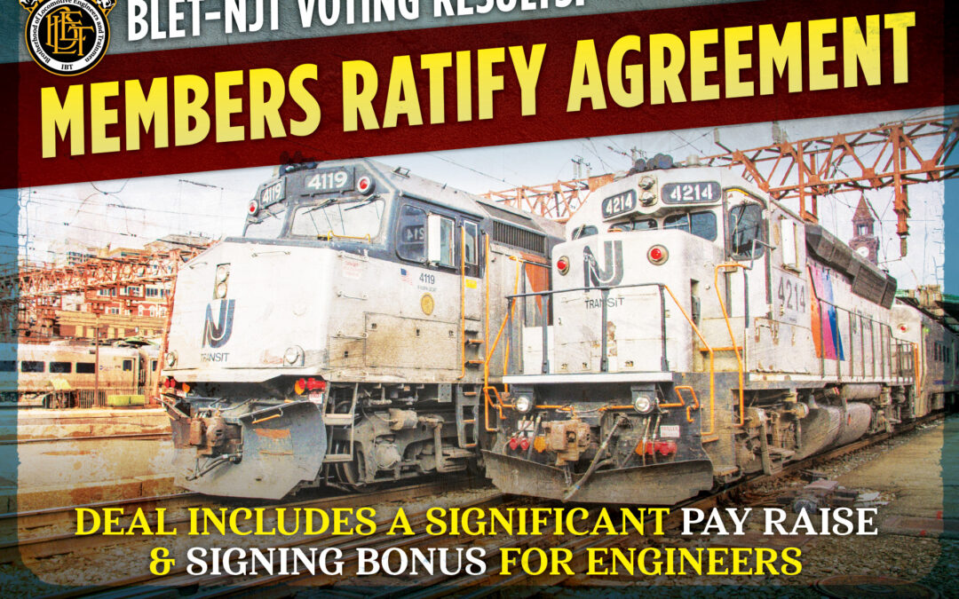 Voting concluded today for members of the Brotherhood of Locomotive Engineers and Trainmen (BLET) for a new collective bargaining agreement with NJ Transit (NJT), the nation’s third largest commuter railroad. BLET members at NJT voted to accept a tentative agreement reached with the commuter railroad’s management on May 18, ending a contract battle that stretched five years and included a three-day strike that shut down the railroad last month.