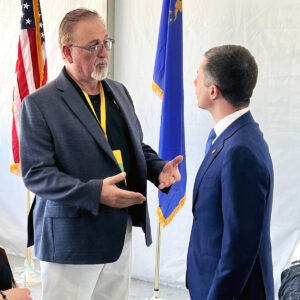BLET National President Eddie Hall (left) speaks with U.S. Secretary of Transportation Pete Buttigieg at the Brightline West ceremony.