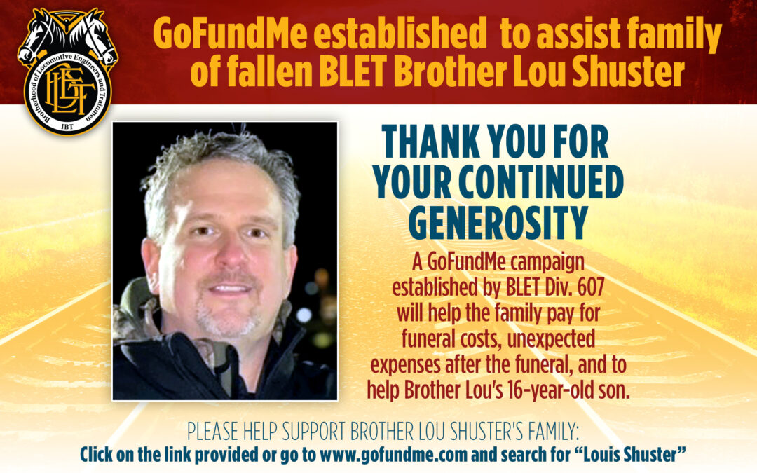 Sadly, Brother Shuster’s death was the second major tragedy to impact his family in recent months. “Two months ago, Brother Lou had lost his brother, and now his parents will be burying their second child in three months, and this is an unfortunate expense nobody wants,” wrote GoFundMe organizer and BLET Division 607 member Alan Thompson. To donate to the GoFundMe campaign organized by Brother Thompson and Division 607 Local Chairman Pat Redmond, please visit: