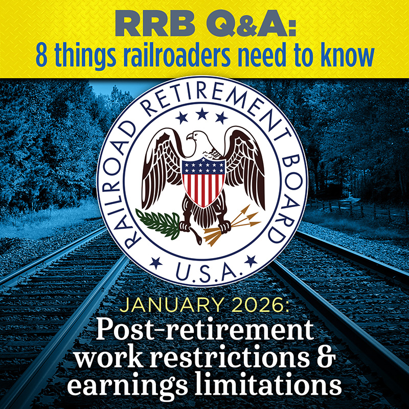 The RRB has prepared an extensive list of questions and answers to describe railroad retirement work restrictions and earnings limitations on post-retirement employment. Please visit the RRB website to read the full Q&A. More information is also available on the RRB’s FAQ page under “Earnings & Working After Retirement,” or by calling RRB at (877) 772-5772.