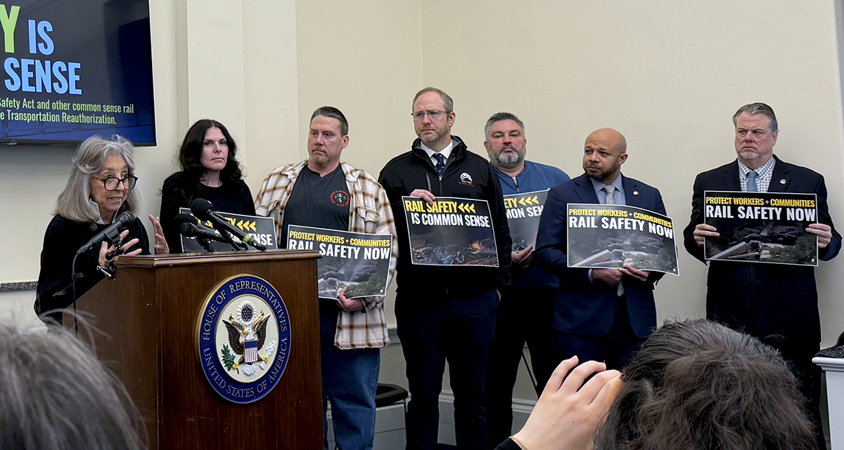 The February 3 press conference, hosted by the AFL-CIO’s Transportation Trades Department (TTD), included remarks by Representatives Dina Titus (D-NV), Chris Deluzio (D-PA), Mike Rulli (R-OH), John Garamendi (D-CA), and Representative Mike Lawler (R-NY). Representative DeLuzio is the lead sponsor of the Railway Safety Act (H.R. 928) and Representatives Rulli, Garamendi, and Lawler are all cosponsors of the legislation. All the Members of Congress voiced bipartisan support for rail safety reform in their remarks.