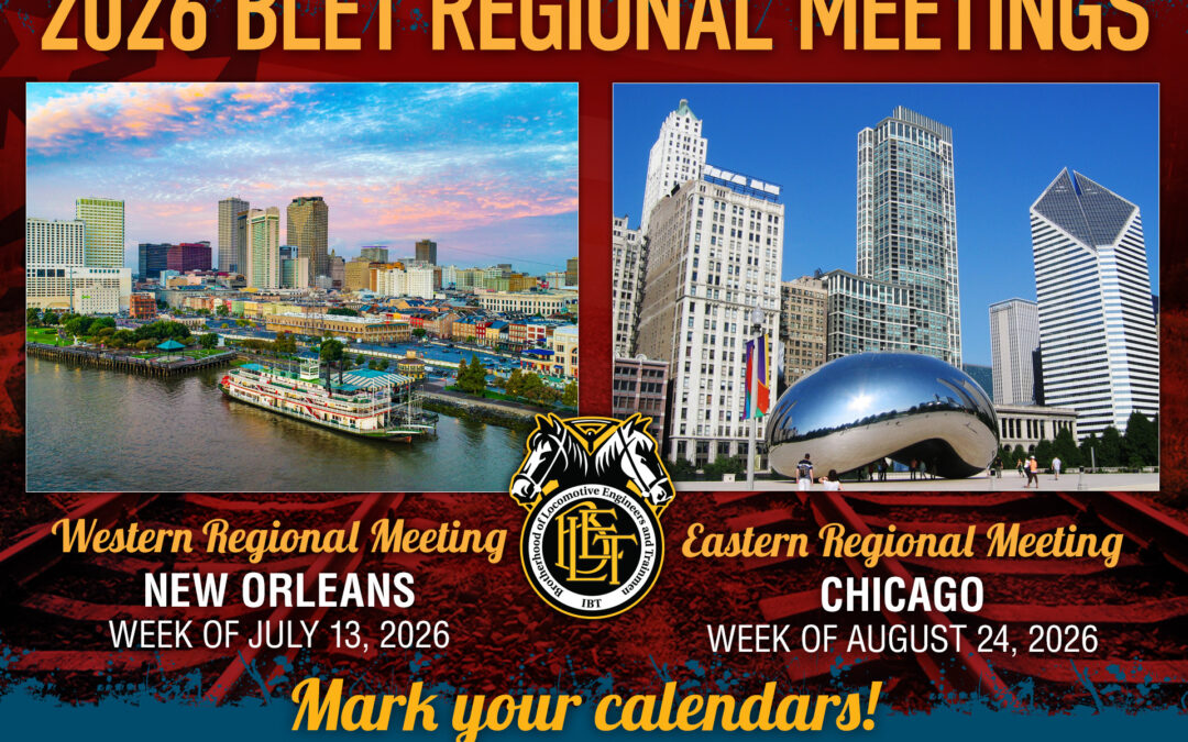 The BLET’s 2026 Western Regional Meeting will be held in New Orleans, Louisiana, the week of July 13. The 2026 Eastern Regional Meeting will take place in Chicago, Illinois, the week of August 24. As many BLET members are getting ready to schedule their vacations for 2026, this would be a good time to make plans now to attend one or both of these meetings. The meetings and training sessions are available at no cost to BLET members (but there is a fee for meals).